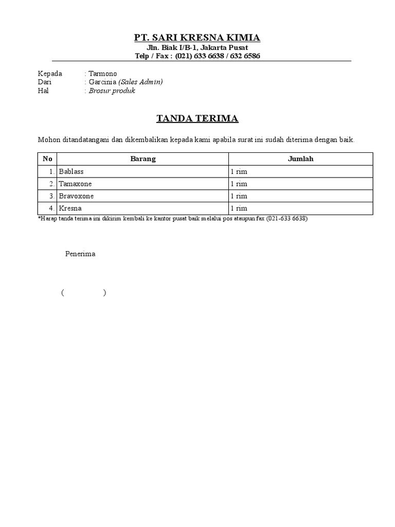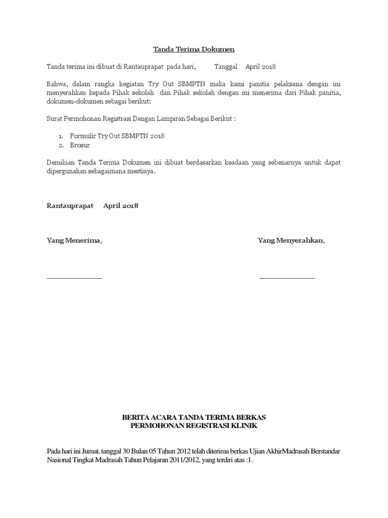 Tanda Terima Dokumen / Tanda Terima Berkas Pdf Document ... from cf.shopee.co.id Untuk download draf tanda terima dokumen (ms word document), silahkan ikuti link di bawah ini. Tanda terima sangat penting baik untuk keperluan perorangan maupun untuk aktivitas perkantoran instansi atau perusahaan. Dengan sertifikat serah terima, perusahaan dapat mengetahui bahwa satu atau lebih karyawan yang bertanggung jawab untuk menyerahkan dokumen atau barang melakukan pekerjaan dengan baik. Contoh surat 3 contoh surat berita acara serah terima barang. Tim olahraga sekolah, band, orkestra, klub catur, atau pertunjukan teater dapat menggunakan templat tanda terima di word setelah acara penggalangan dana untuk berterima kasih kepada donatur dan menghargai dukungan mereka. Contoh surat tanda terima barang pinjaman Jual custom cetak ncr 4 ply tanpa karbon ukuran 21 x 16cm untuk surat jalan tanda terima nota invoice bukti kas di lapak easy print bukalapak. Bahwa, dalam rangka permohonan registrasi klinik maka pihak kedua dengan ini menyerahkan kepada pihak pertama dan pihak pertama dengan ini menerima dari pihak kedua, dokumendokumen sebagai berikut: